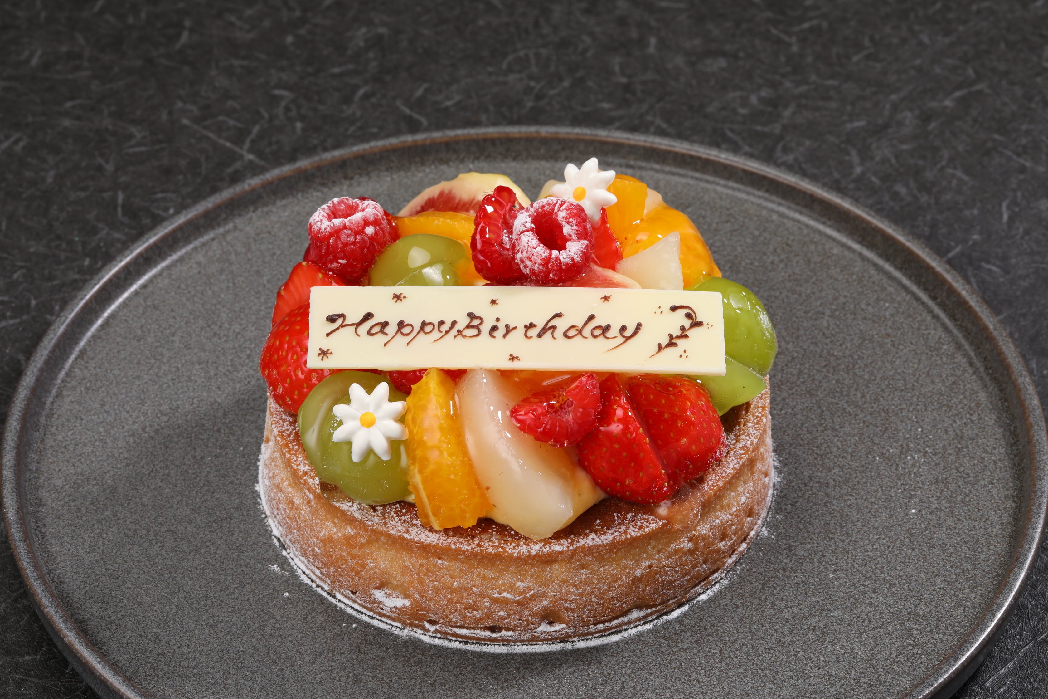 アーモンドクリームを使ったサクサクのタルト生地に生クリームとカスタードを合わせたクリームをのせ、フルーツを飾りました。