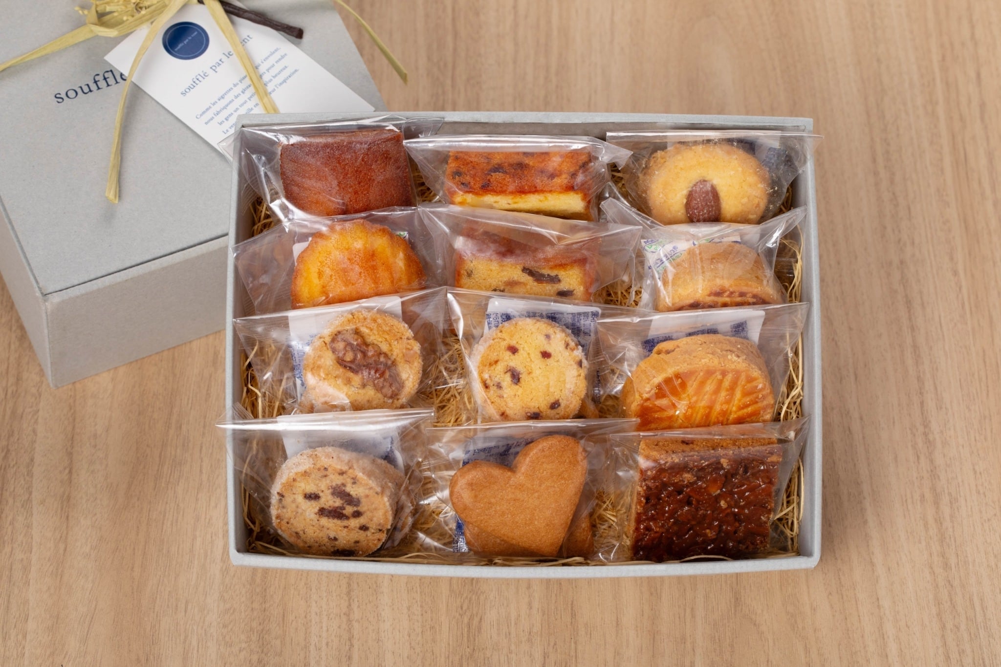 フィナンシェ、マドレーヌ、ケークオフリュイ、アマンドサブレ、あんずとくるみのパウンドケーキ、フロランタン、ガレットブルトンヌ、エピス、くるみのサブレ、クランベリーカルダモン、ドフィノア、サブレショコラノアゼット(全て1個ずつ)