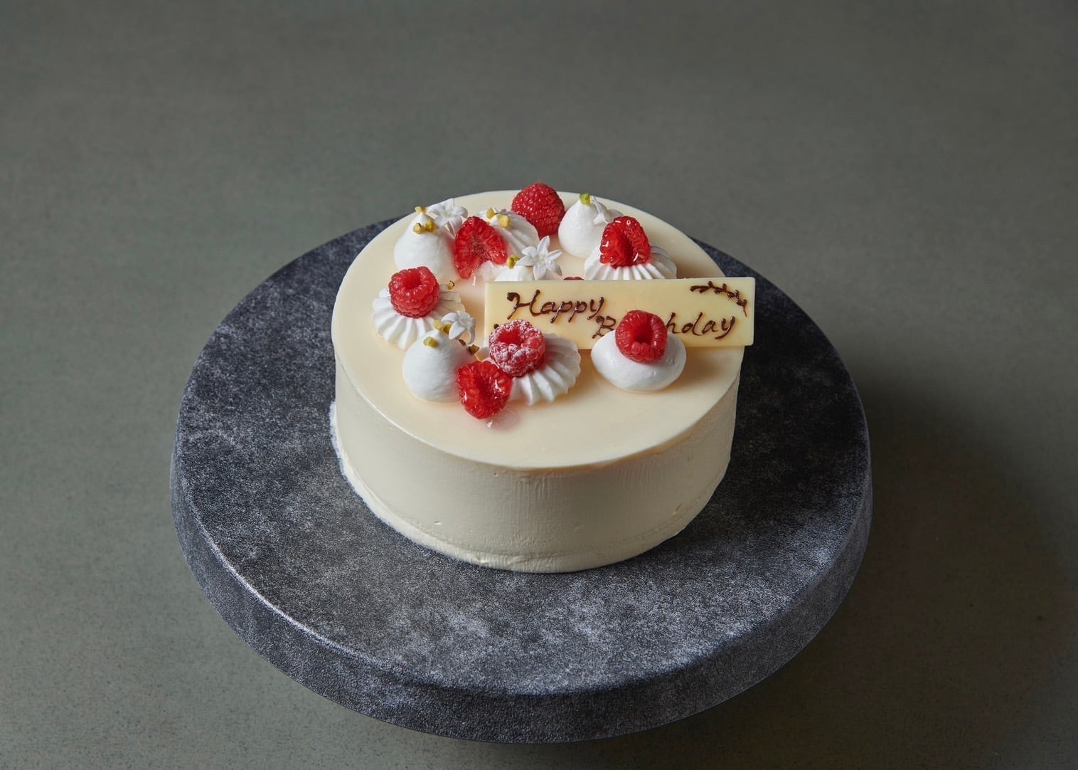 ピスタチオの生地の上にチョコレートのムース、フランボワーズのクリーム、ホワイトチョコレートのムースを四層に重ね仕上げました。